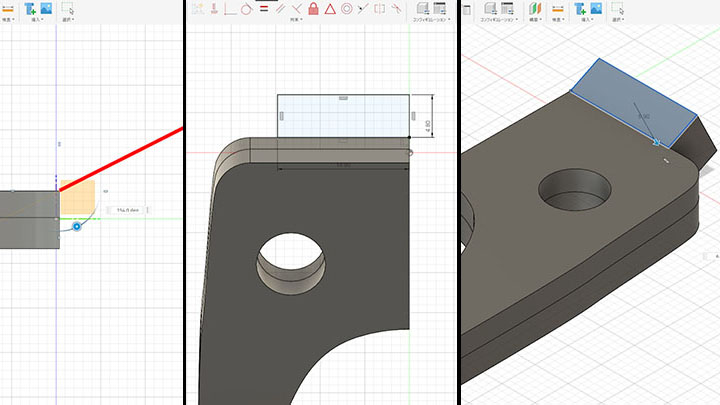 さきほど描いた突起を除ける穴を切り取り、パーツをすべて結合します(下図左~中)。